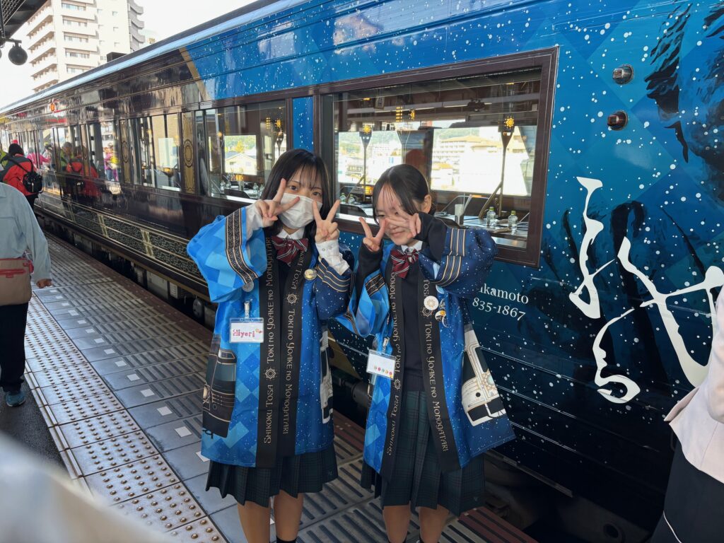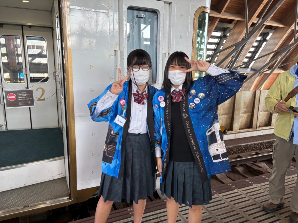 11月8日(土)に観光列車「志国土佐時代の夜明けのものがたり」にツーリズムコースの生徒が乗車し、お客さんにおもてなしをしました。今回の乗車が3年生にとって最後のおもてなしを体験となりました。たくさんのお客様から暖かい言葉をかけていただきありがとうございました。生徒たちにとって貴重な体験学習となりました。